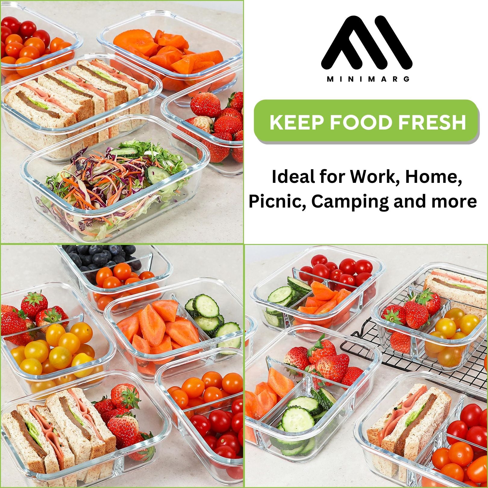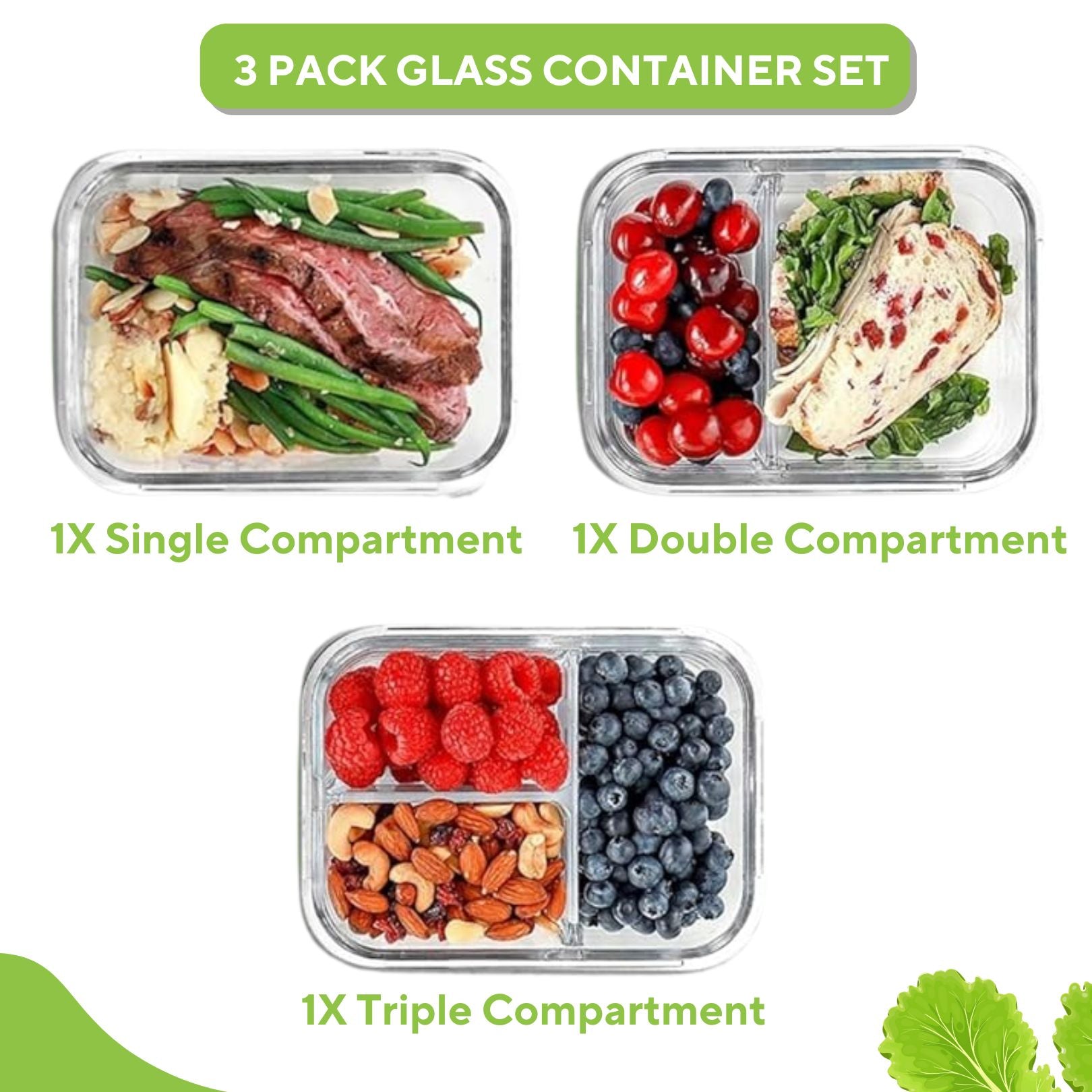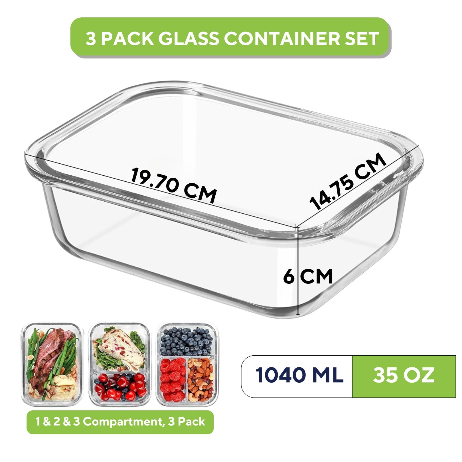 - All-in-one Glass Meal Prep Containers With Lids Set (pack Of 3)-- Get Organized With Our 3-pack Of Big Glass Meal Prep Containers – Package Includes Includes 1x Single, 1x Double & 1x Triple Compartment Glass Food Storage Containers With Lids. Each glass container has Capacity Of (35oz/1040 ML). Ideal For Portion Control. Perfect Food Containers For Leakproof Meal Prep, Lunch, Or Leftovers.